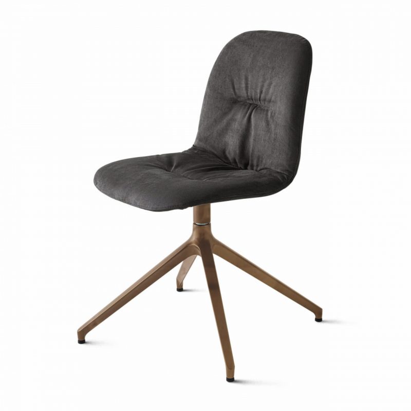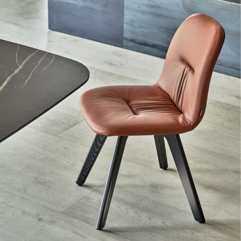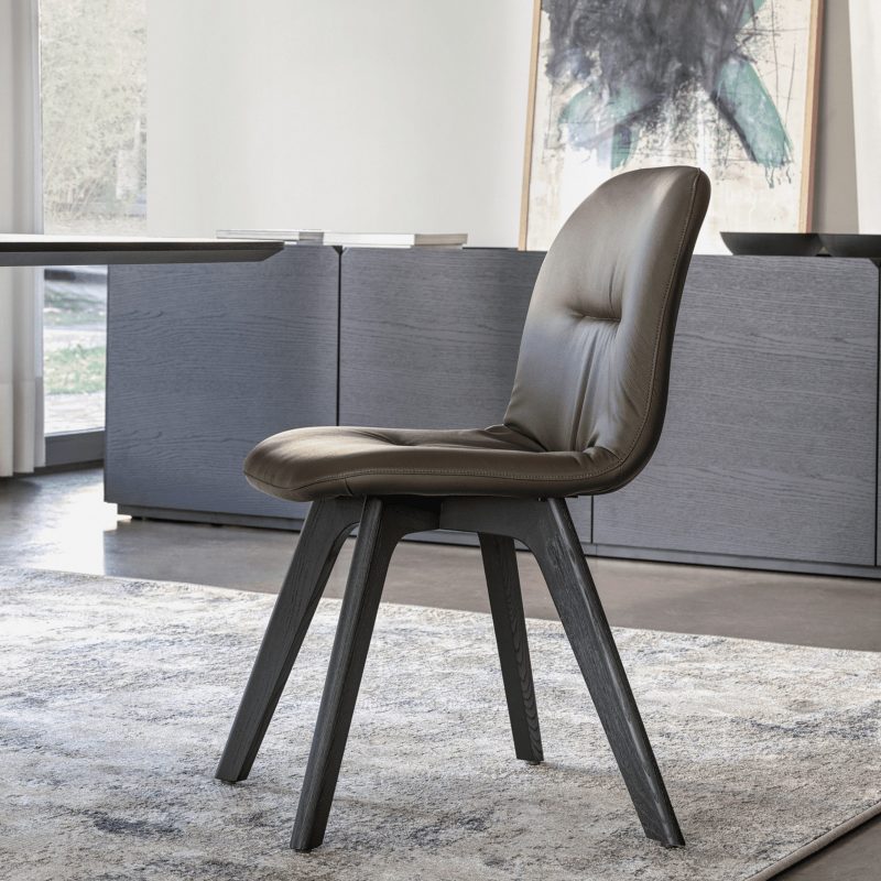 The Chantal is a contemporary upholstered dining chair featuring a gently curved seat in a choice of fabrics and leathers, with stitched detailing. Elegant lacquered metal legs can be selected in four-leg or sleigh-leg styles and in a range of colours for a bespoke look.