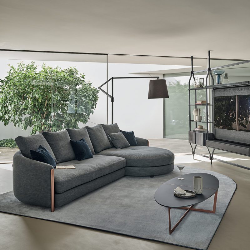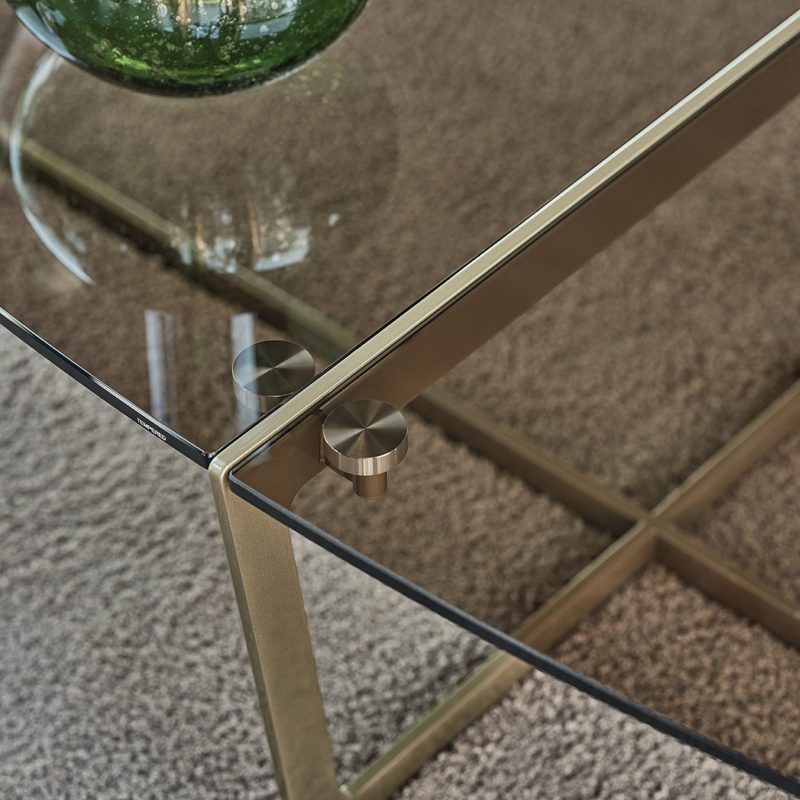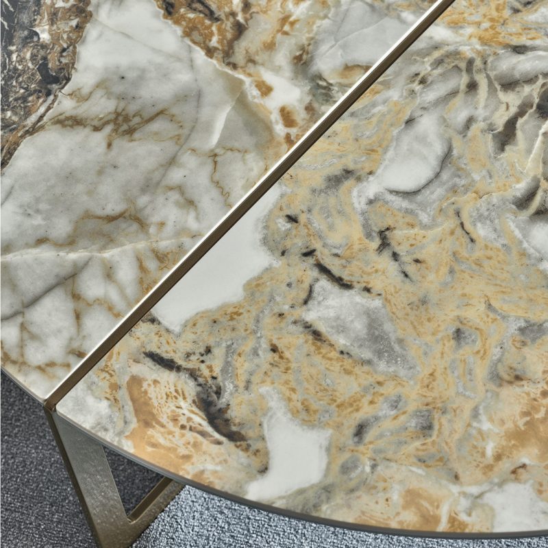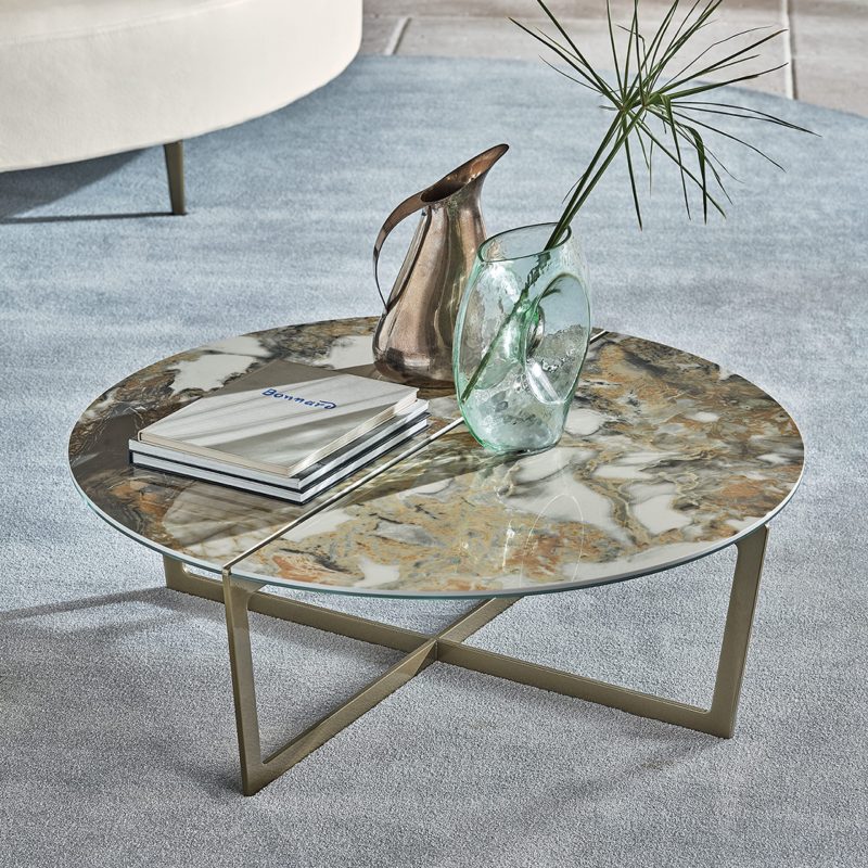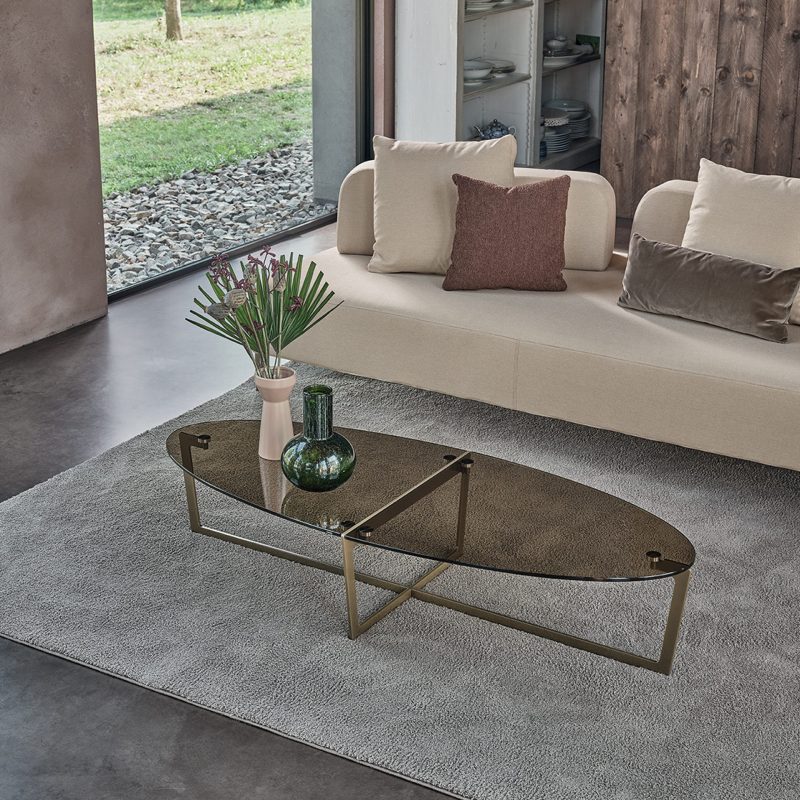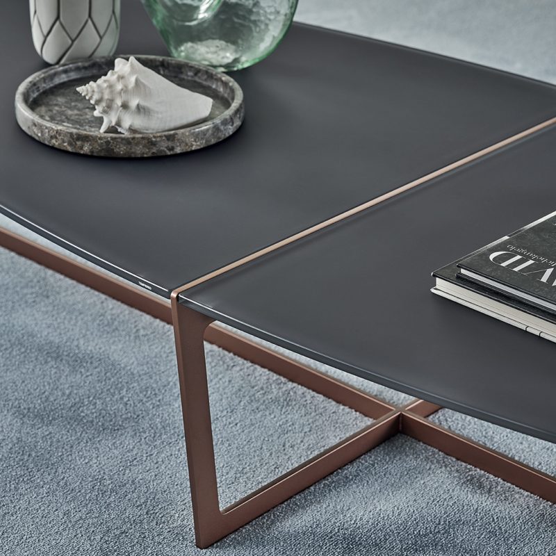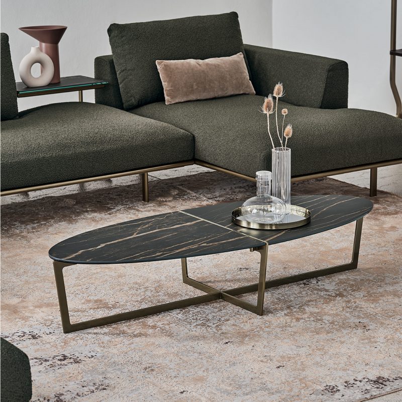The Cross Coffee Table by Bontempi Casa features a distinctive lacquered metal crossover angular base in a range of colourways with a complementing oval or circular table top in two parts, exposing the metal frame along a central split for added interest.