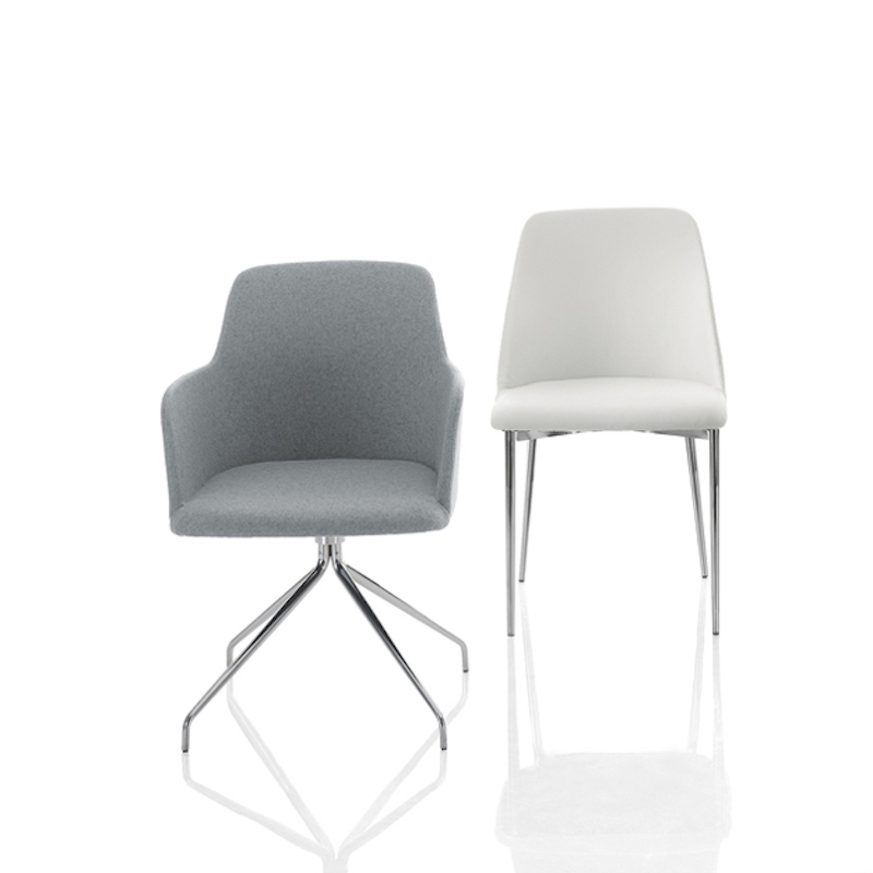 The Margot is a stylish contemporary chair available with or without arms and customisable with a choice of regular legs, spider swivel legs or a central swivel base. The seat and backrest are available in a wide selection of finishes and colours.