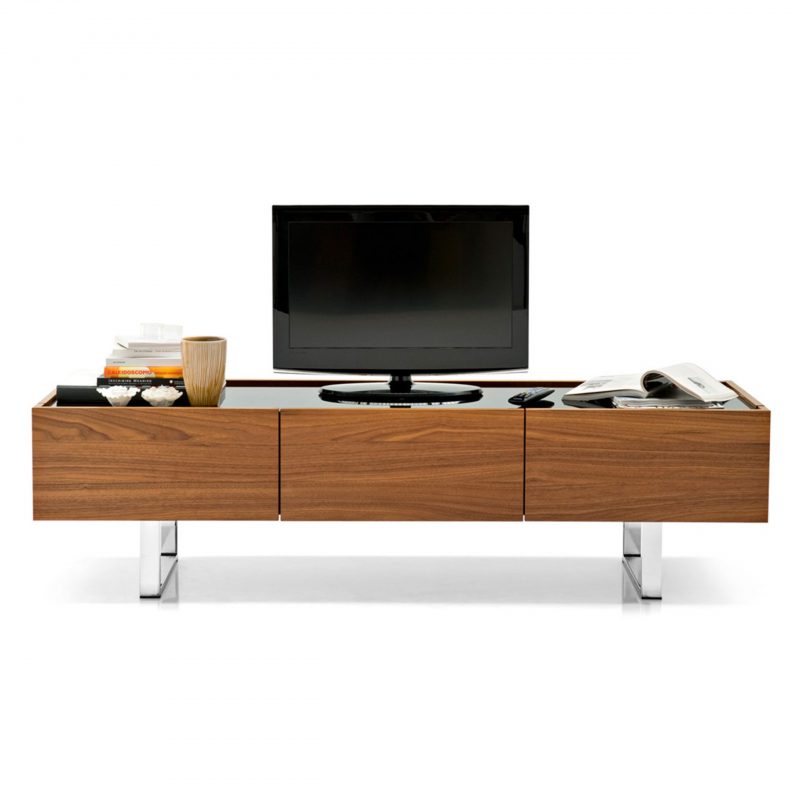 The central compartment, specially designed to contain a decoder or DVD player, is divided by a tempered glass shelf. A practical rear cable passage hole facilitates the connection of the electrical cables. The upper level, with raised edges, is enriched by a glass or ceramic top.