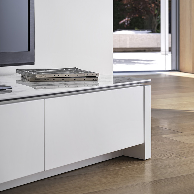 MAG is a range of products with a sleek design and refined personality, where glass and wood are combined in perfect harmony. The three doors of the sideboard are handleless and open by the push-pull opening mechanism. The central compartment, designed specifically to hold the decoder or DVD player, is closed by a drop-down door and contains a tempered glass shelf and a practical rear cable outlet.