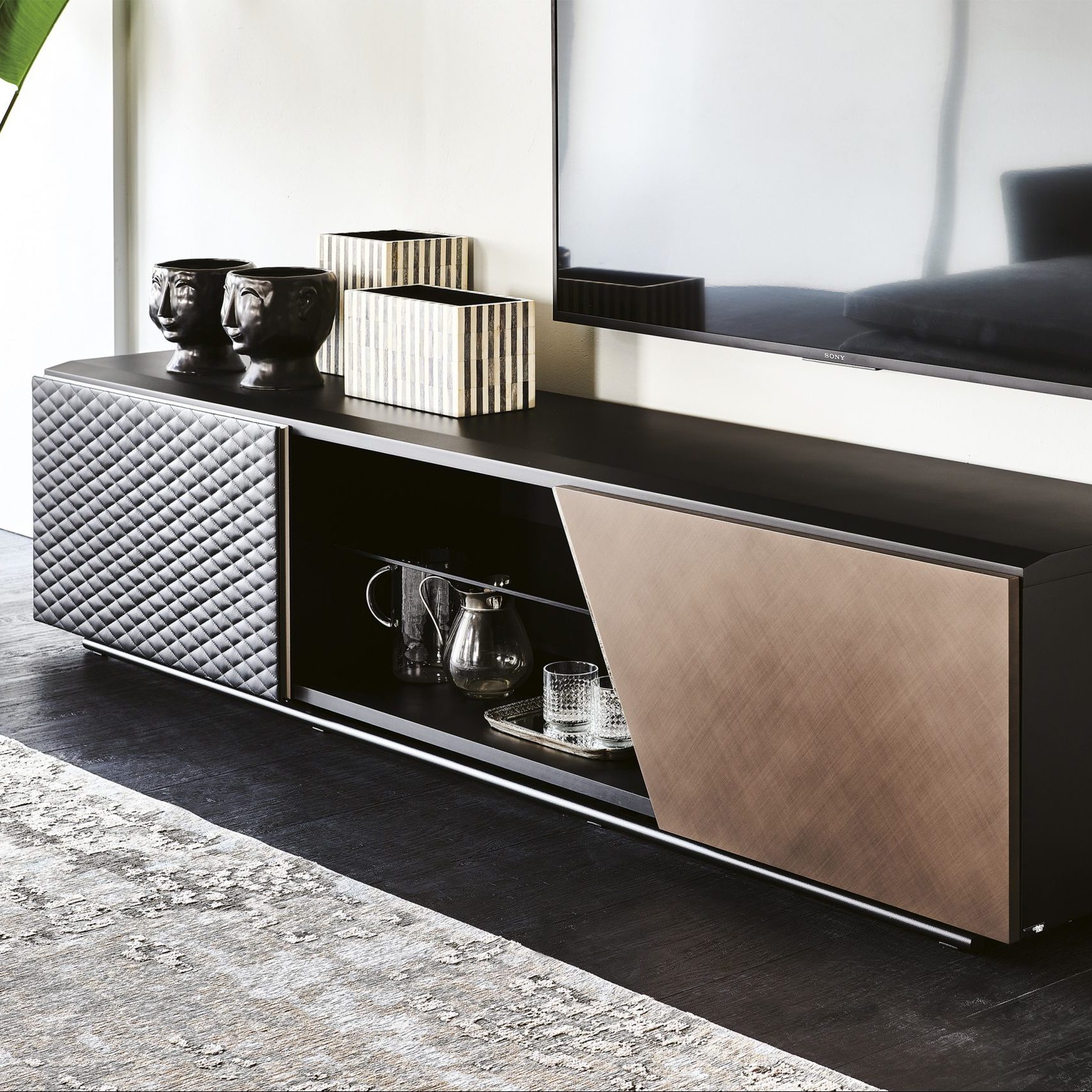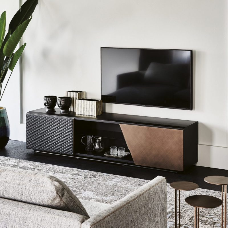 The Cattelan Italia Aston TV Unit is a stylish two-door unit with functional open storage. Featuring a titanium or black lacquered wood frame with a matching embossed steel base.