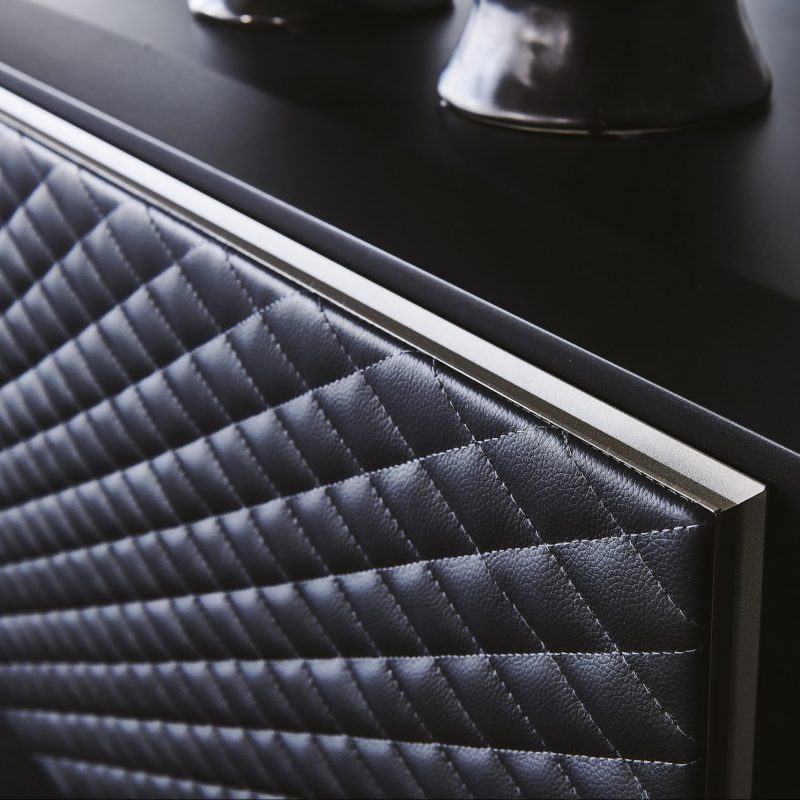 The right-hand door is customisable in Canaletto Walnut, Burnt Oak or Brushed Bronze with black chrome details, while the left-hand door is available in a range of quilted leather options with embossed titanium aluminium profiles.