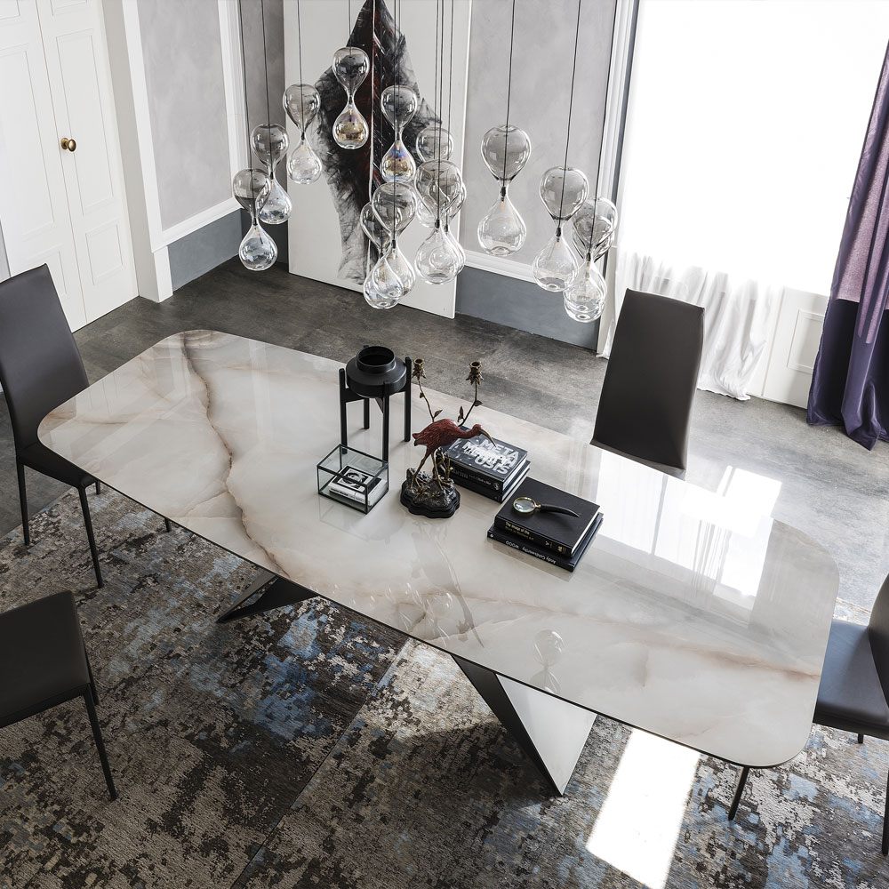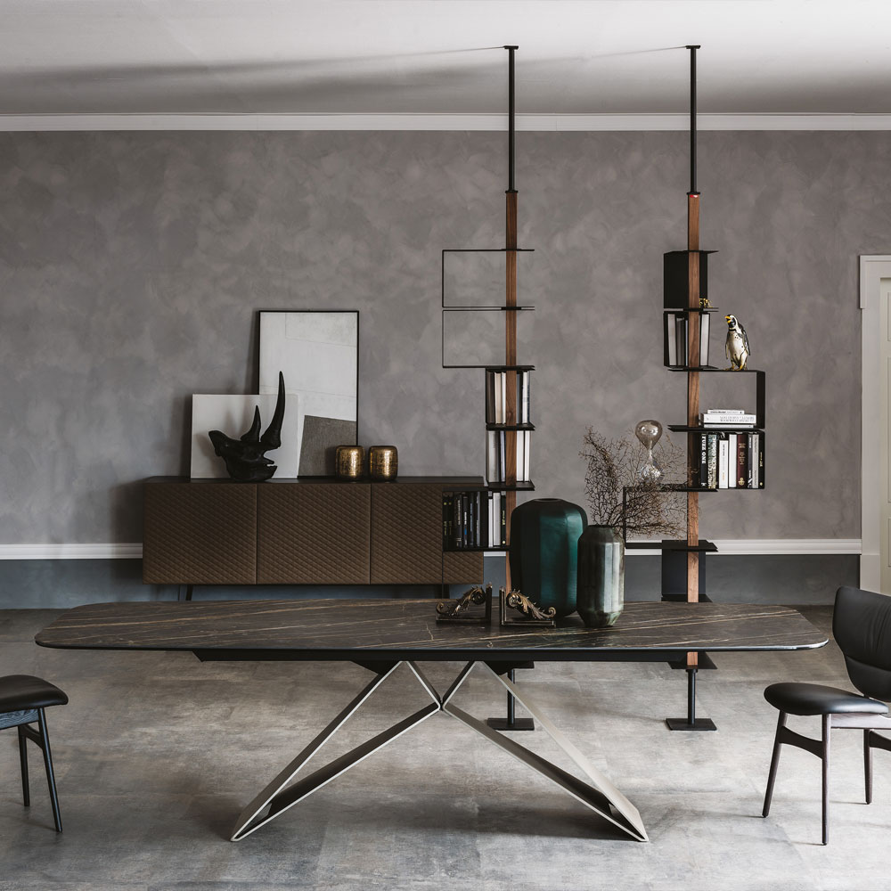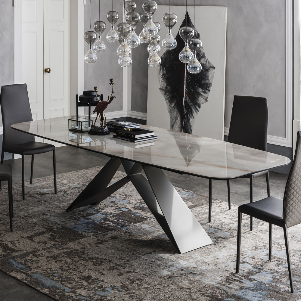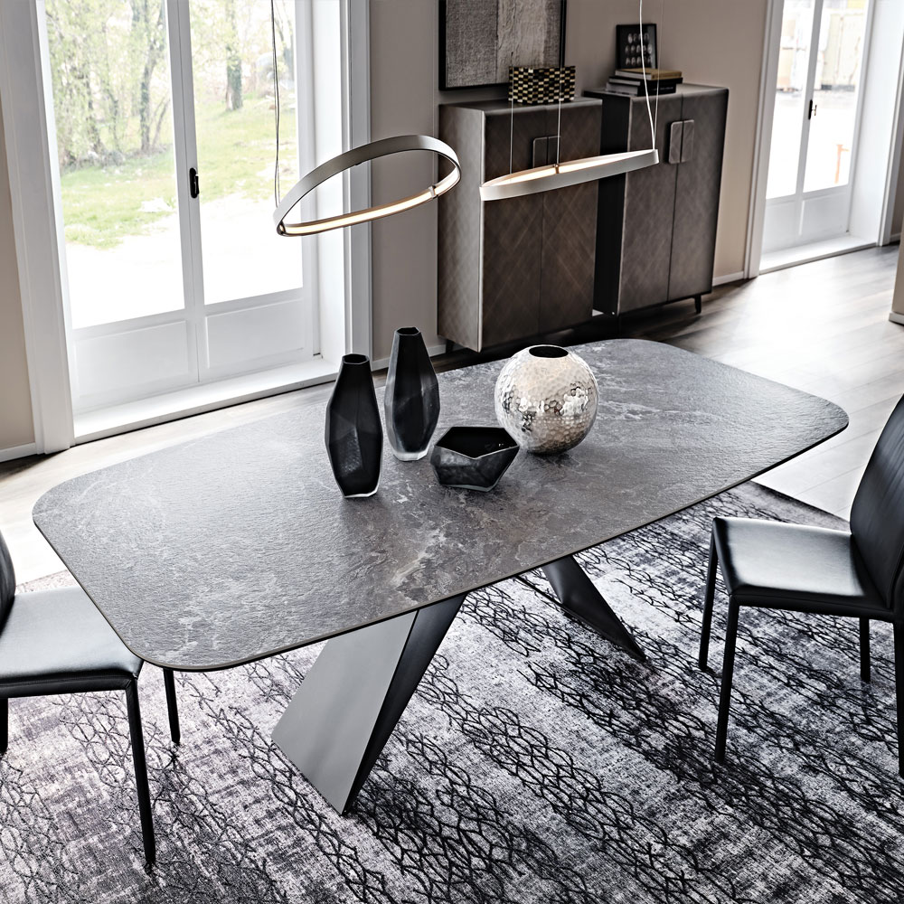 Available in a range of shapes and sizes to suit your home, the stand-out feature of this dining table is the intersecting angular titanium, black or graphite embossed lacquered steel base. This beautifully crafted design is made in Italy, intended to evoke elegance and quality in every aspect of its being. Picture yourself dining with friends and family while the dining table elevates the room with its sophisticated and luxury design.