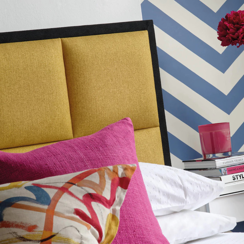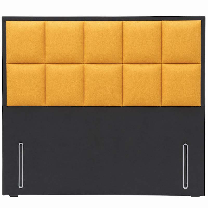 A striking headboard comprised of two rows of square panels, set within a border upholstered in either contrasting black fabric as standard, or optionally in the same fabric as the squares.